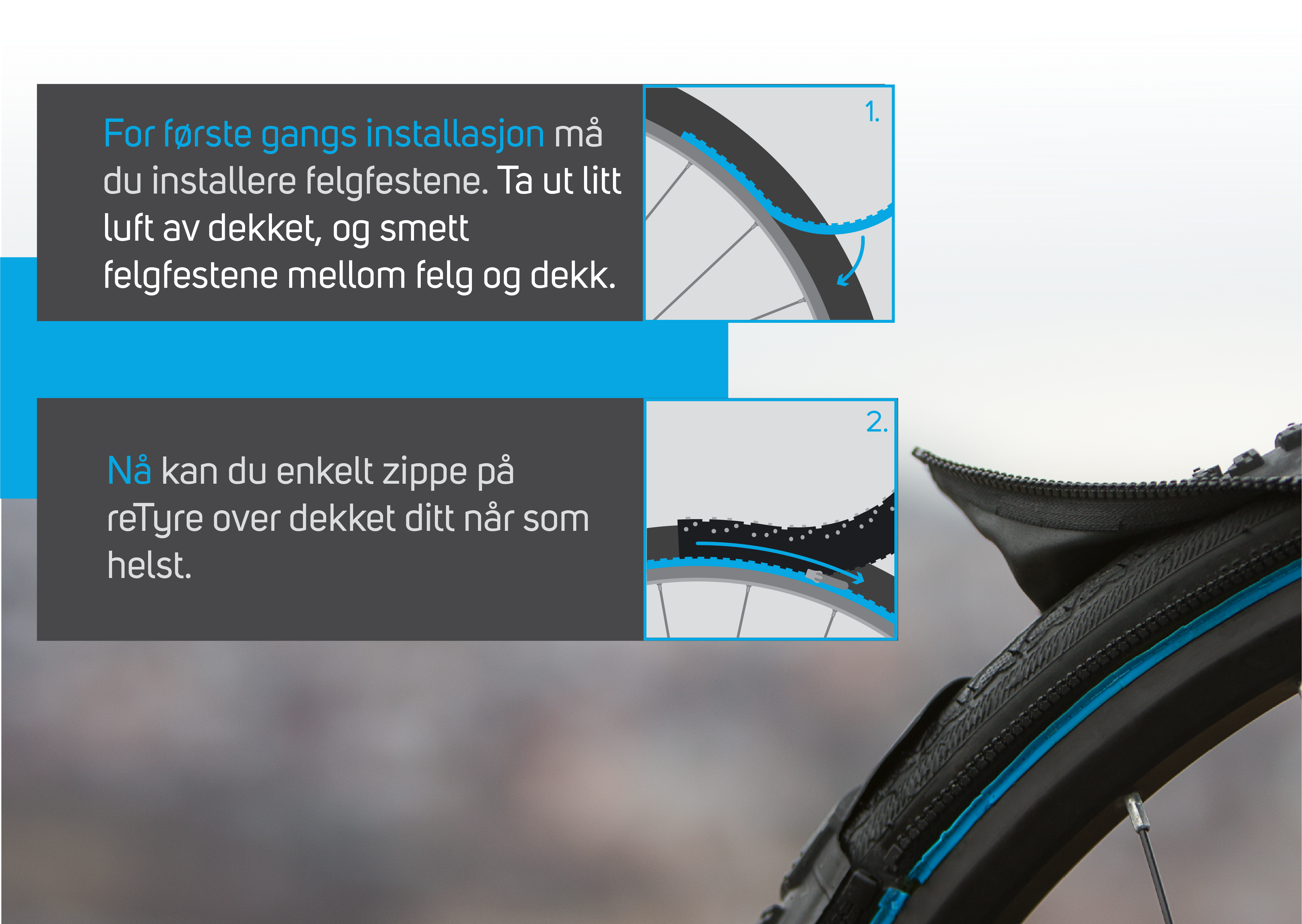 Vi elsker å gjøre ting enkelt, og vårt mål med reTyre er å gjøre din sykkelopplevelse bedre ved å gjøre dekkbytte like enkelt som å bytte sko. Først ut er reTyre Urban Winter - piggdekket du monterer rett utenpå sommerdekket ved hjelp av glidelås!