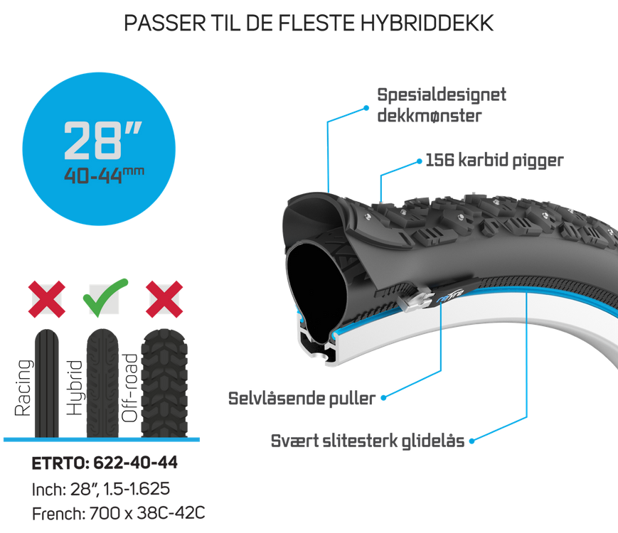 reTyre er ikke bare for vintersyklisten, men for deg som vil sykle lengst mulig om høsten og tidligst mulig om våren. Ikke bekymre deg for vekslende veiforhold, med reTyre kan du «sko om» dekkene dine på få minutter. 156 pigger og grovt dekkmønster gir deg optimalt veigrep.